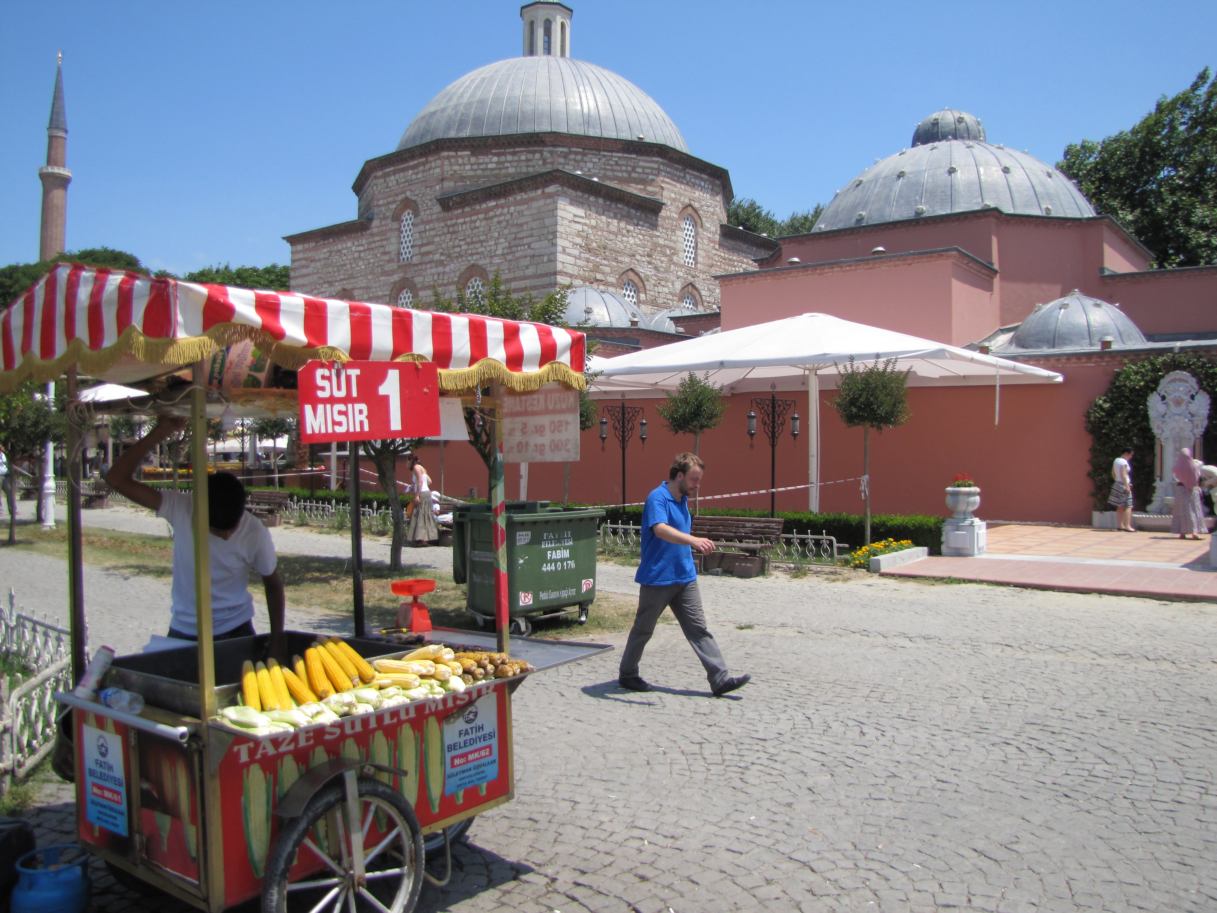 바깥에서 본 성당. 옆에 옥수수 장사가 이채로움. 1리라에 판매되는 구운 옥수수는 터키방문객들이 꼭 먹어야할 음식중에 하나로 꼽힌다. |